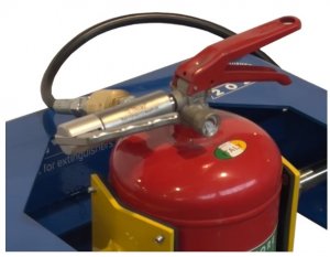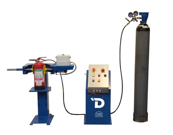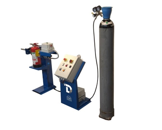 Součástí systému je také pneumatický svěrák, který umožňuje bezpečné upnutí hasicích přístrojů během procesu natlakování. Požadované napájení: 220 V, 50 Hz, jednofázové.