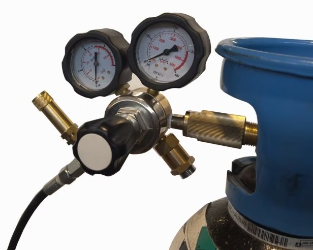 Automatický systém natlakování dusíkem (N2) pro práškové hasicí přístroje s permanentním tlakem, vybavený automatickým vypnutím při dosažení nastaveného tlaku.